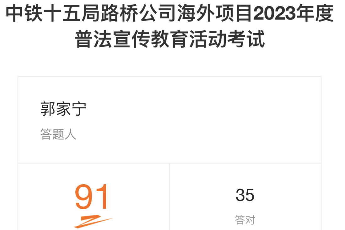 活動期間,公司境外項目開展線上法律知識測試活動,試卷內(nèi)容涉及憲法、民法 、安全生產(chǎn)法等法律法規(guī)知識,深入貼合職工生活和工作實際,針對性強。通過以考促學(xué)、以考促用,為建設(shè)法治路橋、平安路橋提供堅強有力保障。