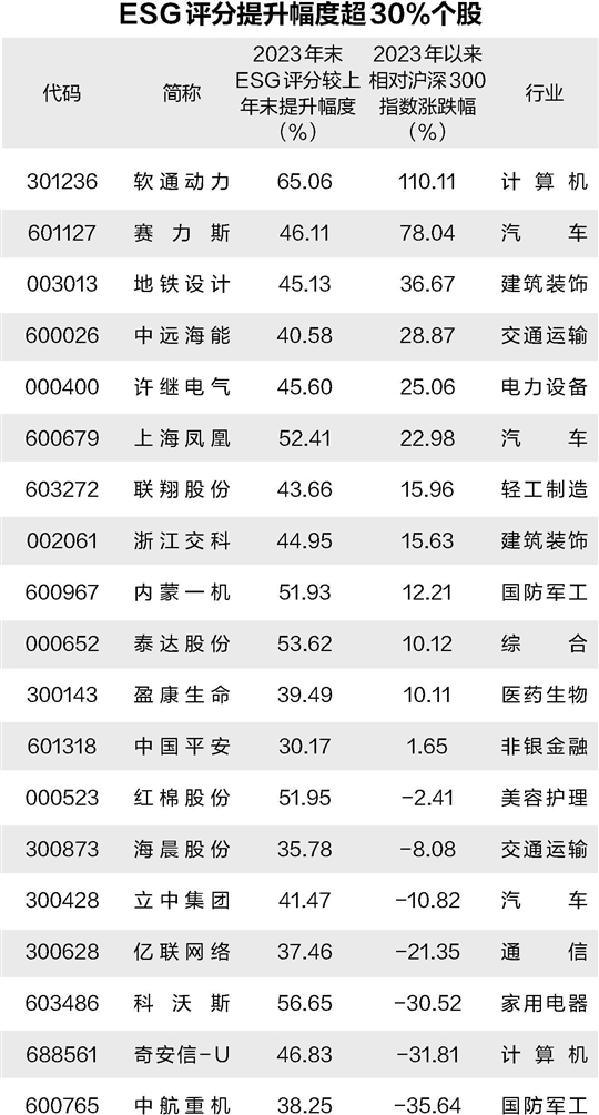 數(shù)據(jù)顯示,截至昨日收盤(下同),19只ESG先鋒股2023年以來相對滬深300指數(shù)的平均超額收益率為11.9%,超六成個股跑贏滬深300指數(shù)。其中,軟通動力、賽力斯超額收益率超70%;地鐵設計、中遠海能超額收益率超28%。