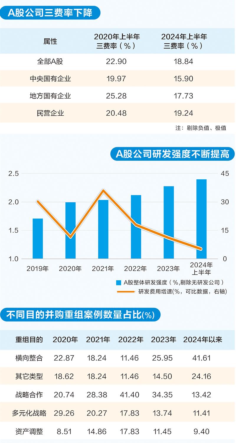 技術創(chuàng)新是推動企業(yè)高質量發(fā)展的核心引擎。在成本管控的同時,加強創(chuàng)新才能帶來效益提升。根據(jù)半年報數(shù)據(jù),A股上市公司研發(fā)費用逐年遞增,2024年上半年超過7100億元,同比增長(可比數(shù)據(jù))5%以上;同期研發(fā)強度達到2.4%,創(chuàng)2019年以來同期最高水平(2018年以前數(shù)據(jù)不完整)。