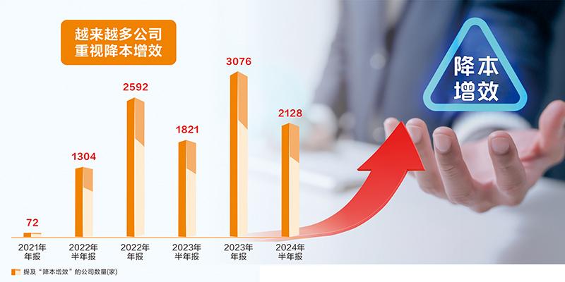 據(jù)證券時報·數(shù)據(jù)寶統(tǒng)計,在半年報或年報中提及“降本增效”這一關鍵詞的上市公司數(shù)量呈逐年上升趨勢。2022年年報提及的公司接近2600家,此前一年不足百家;2023年年報提及的公司數(shù)量再創(chuàng)新高,超過3000家。2024年半年報中,超過2100家公司再度提及降本增效,數(shù)量依然創(chuàng)下歷史同期最高。