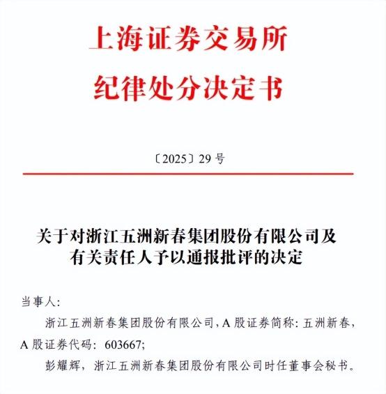 不過,五洲新春的這一系列動(dòng)作并未能完全消除市場(chǎng)的疑慮。在股價(jià)異動(dòng)后,公司雖然及時(shí)發(fā)布了澄清公告,但監(jiān)管機(jī)構(gòu)的處罰決定仍然如期而至。上交所對(duì)五洲新春及時(shí)任董事會(huì)秘書彭耀輝予以通報(bào)批評(píng),浙江證監(jiān)局也對(duì)五洲新春及彭耀輝分別采取了出具警示函的監(jiān)督管理措施,并記入證券期貨市場(chǎng)誠信檔案。