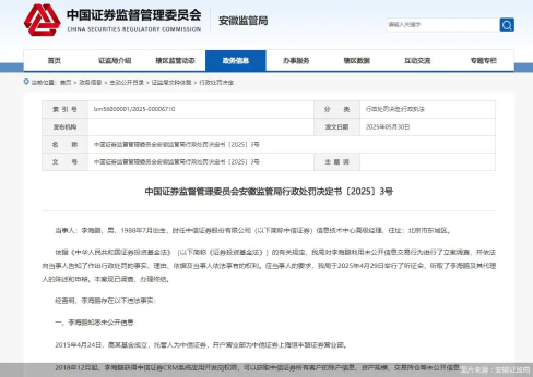 5月30日,安徽證監(jiān)局發(fā)布公告指出,時(shí)任中信證券信息技術(shù)中心高級(jí)經(jīng)理李海鵬存在違法行為,其獲得中信證券CRM系統(tǒng)應(yīng)用開(kāi)發(fā)崗權(quán)限,可以獲取中信證券所有客戶的賬戶信息、資產(chǎn)規(guī)模、交易持倉(cāng)等未公開(kāi)信息。2019年11月1日至2023年2月21日,李海鵬通過(guò)CRM系統(tǒng),獲知高某基金的持倉(cāng)、委托、當(dāng)日成交記錄等未公開(kāi)信息,其利用未公開(kāi)信息違規(guī)交易股票,同時(shí)存在趨同交易的情況。安徽證監(jiān)局決定,沒(méi)收李海鵬違法所得213.14萬(wàn)元,并處以213.14萬(wàn)元罰款。