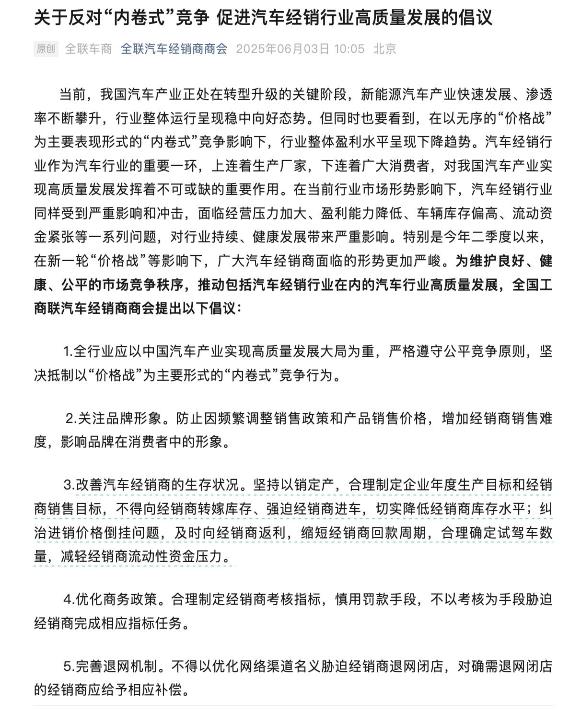 6月3日,全國工商聯(lián)汽車經(jīng)銷商商會發(fā)布《關于反對“內卷式”競爭 促進汽車經(jīng)銷行業(yè)高質量發(fā)展的倡議》。