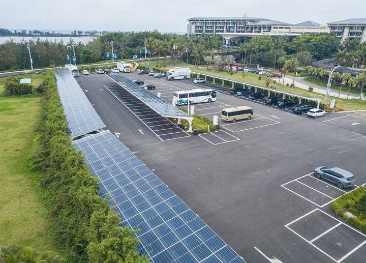 2025年3月16日在海南博鰲零碳示范區(qū)拍攝的建有光伏發(fā)電設備的停車場(無人機照片)。新華社記者 蒲曉旭 攝