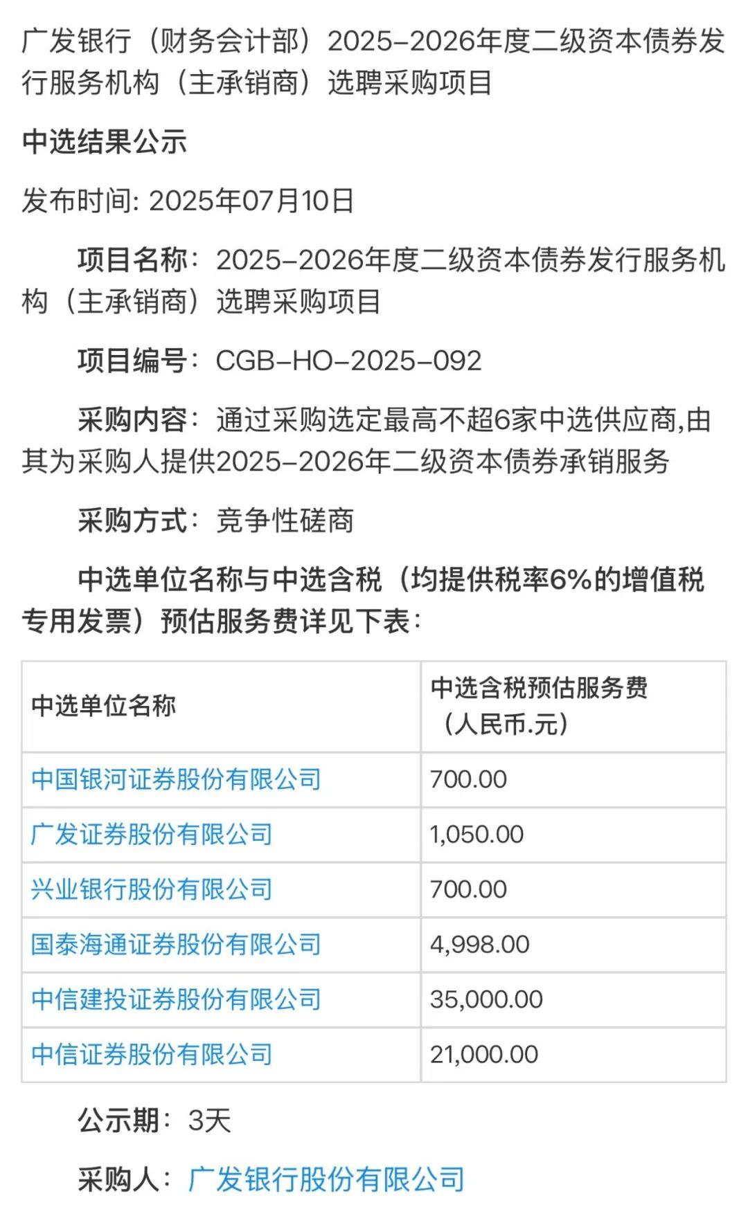 7月10日,廣發(fā)銀行對上述項(xiàng)目中選結(jié)果進(jìn)行公示,中國銀河證券、廣發(fā)證券、興業(yè)銀行、國泰海通證券、中信建投證券、中信證券等6家機(jī)構(gòu)中選,承銷服務(wù)費(fèi)總額63448元,提供稅率6%的增值稅專用發(fā)票。
