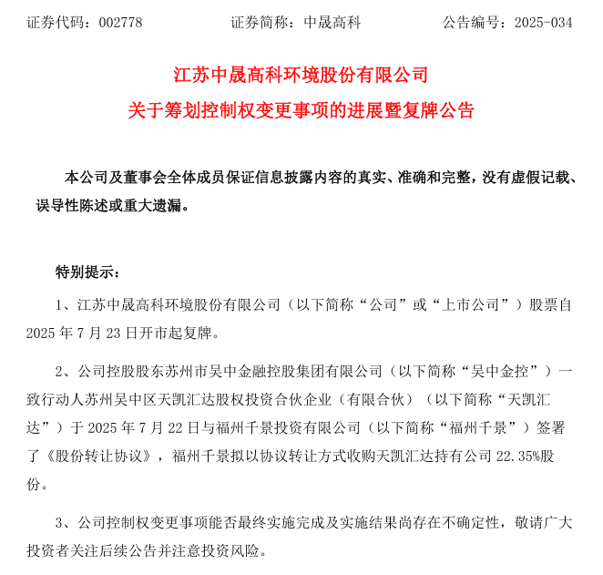 7月22日晚,中晟高科發(fā)布《關于籌劃控制權變更事項的進展暨復牌公告》稱,公司控股股東蘇州市吳中金融控股集團有限公司(以下簡稱“吳中金控”)一致行動人蘇州吳中區(qū)天凱匯達股權投資合伙企業(yè)(有限合伙)(以下簡稱“天凱匯達”)于7月22日與福州千景投資有限公司(以下簡稱“福州千景”)簽署了《股份轉讓協(xié)議》,福州千景擬以協(xié)議轉讓方式收購天凱匯達持有公司22.35%股份。公司股票自7月23日開市起復牌。