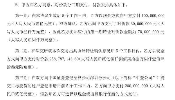 對價款分三期支付。第一期在本協(xié)議生效后5個工作日內,福州千景以現(xiàn)金方式向天凱匯達支付1億元;雙方確認,福州千景已向天凱匯達支付了對價款3000萬元,因此福州千景實際應付的第一期轉讓對價款金額為7000萬元。第二期在深交所就本次交易出具協(xié)議轉讓確認意見后5個工作日內,福州千景以現(xiàn)金方式向天凱匯達支付對價款2.59億元。第三期在雙方向中國證券登記結算公司深圳分公司提交目標股份的過戶登記申請日前5個工作日內,福州千景向天凱匯達支付2億元,可選擇以現(xiàn)金或出具銀行保函的方式支付。