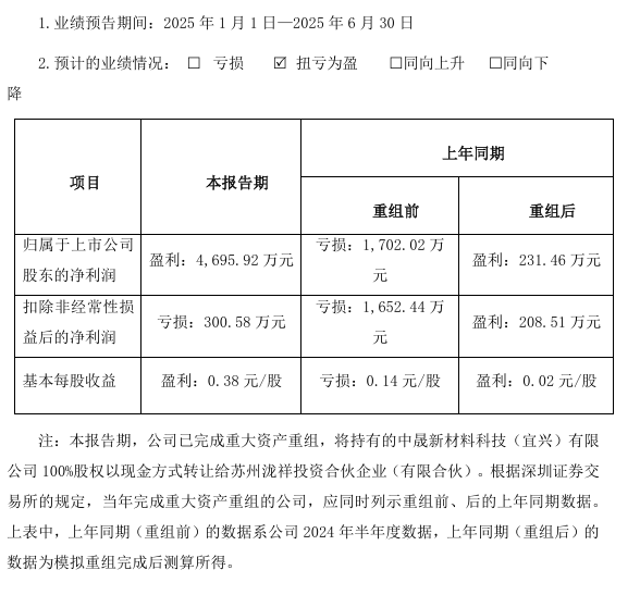 公司稱,公司實施完成重大資產(chǎn)重組,將持有的中晟新材料科技(宜興)有限公司100%股權以現(xiàn)金方式轉讓給蘇州瀧祥投資合伙企業(yè)(有限合伙),產(chǎn)生投資收益4846.38萬元。公司環(huán)保板塊上半年工程結算收入較少,導致扣除非經(jīng)常性損益后歸屬于上市公司股東的凈利潤為負數(shù)。