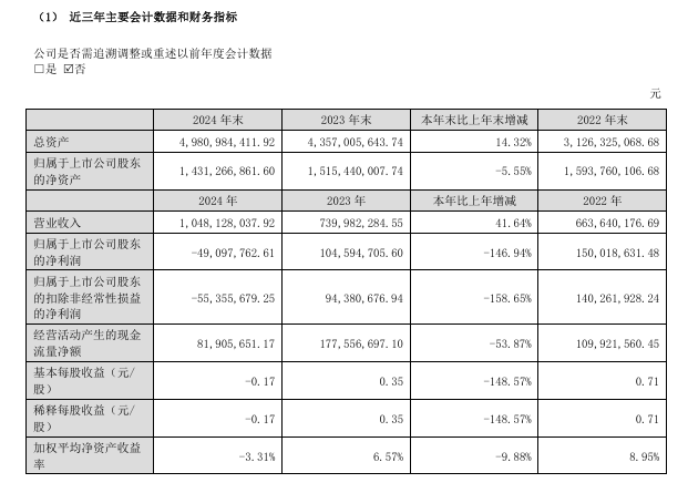 2024年,廣聯(lián)航空實現(xiàn)營業(yè)收入10.48億元,同比增長41.64%;歸屬于上市公司股東的凈利潤虧損4909.78萬元,由盈轉虧。