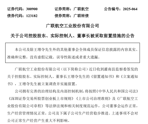 7月22日晚間,廣聯(lián)航空公告,控股股東、實控人、董事長王增奪被立案調查并實施留置。