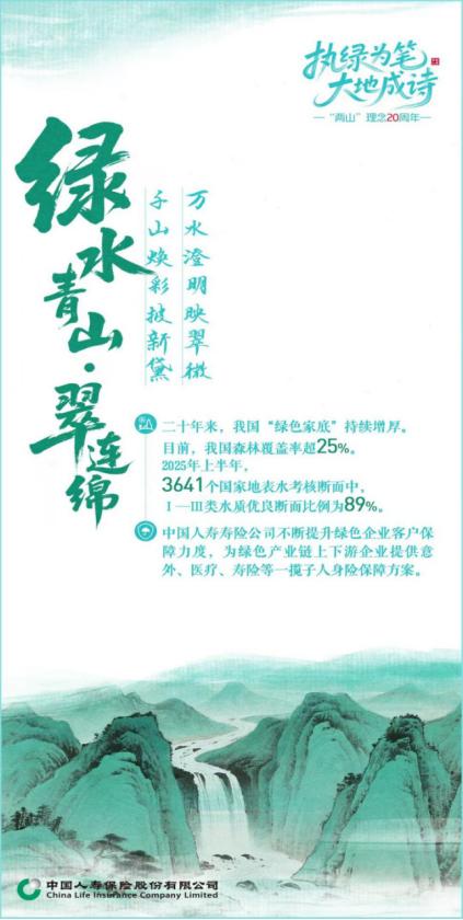 青山鋪卷,金融作筆;執(zhí)筆為綠,大地成詩。在奔赴“雙碳”目標(biāo)的壯闊征途上,中國人壽正以中國式ESG的生動實(shí)踐,為全球可持續(xù)發(fā)展貢獻(xiàn)東方智慧,書寫著不負(fù)綠水青山的時代新篇。