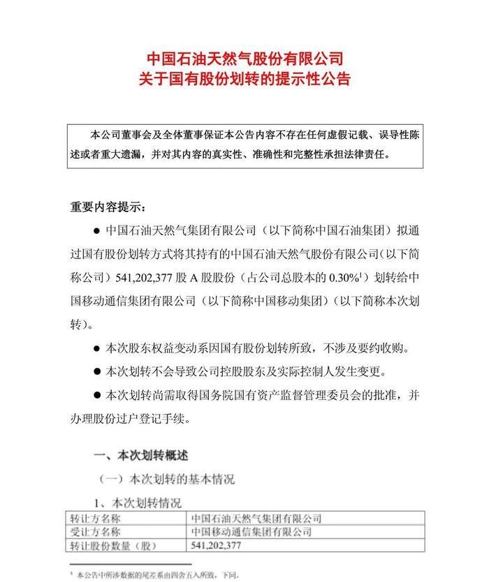 中國石油集團和中國移動集團已簽署股份劃轉(zhuǎn)協(xié)議,本次劃轉(zhuǎn)尚需取得國務(wù)院國有資產(chǎn)監(jiān)督管理委員會的批準并辦理股份過戶登記手續(xù)。