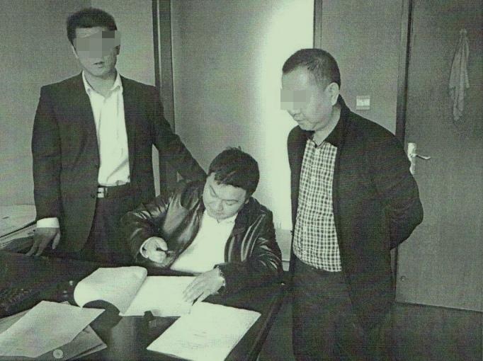 樂山市商業(yè)銀行兩名工作人員與假冒擔(dān)保方銀行工作人員的殷學(xué)明(中)在“面簽”現(xiàn)場。受訪者提供 資料圖
