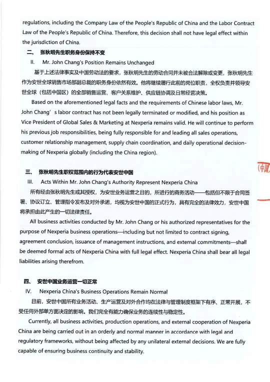 10月23日,安世半導(dǎo)體中國(guó)有限公司發(fā)布聲明稱,近期荷蘭總部單方面免去張秋明銷售市場(chǎng)部副總裁職務(wù)的決定,在中國(guó)法域下不發(fā)生法律效力。
