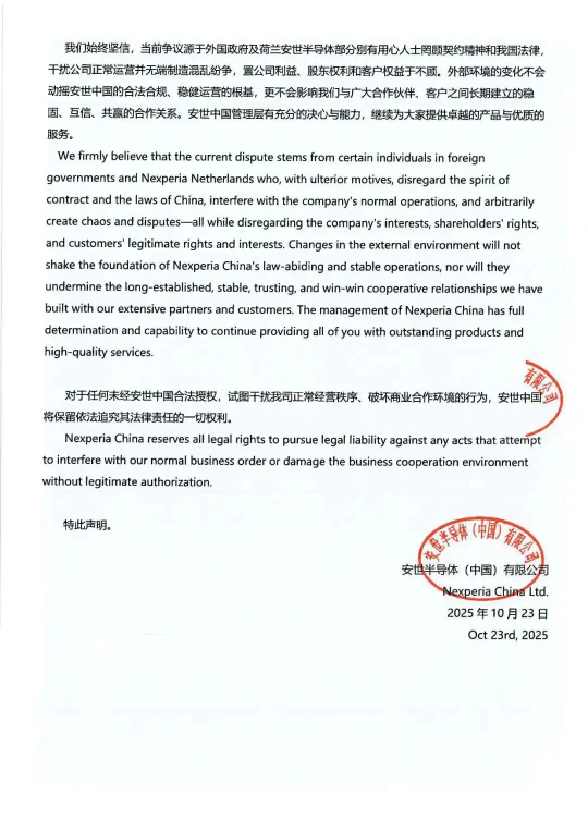 四、安世中國(guó)業(yè)務(wù)運(yùn)營(yíng)一切正常,目前,安世中國(guó)所有業(yè)務(wù)活動(dòng)、生產(chǎn)運(yùn)營(yíng)及對(duì)外合作均在法律與管理制度框架下有序、正常開(kāi)展,不受任何外部單方面決定的影響。我們完全有能力確保業(yè)務(wù)的連續(xù)性與穩(wěn)定性。