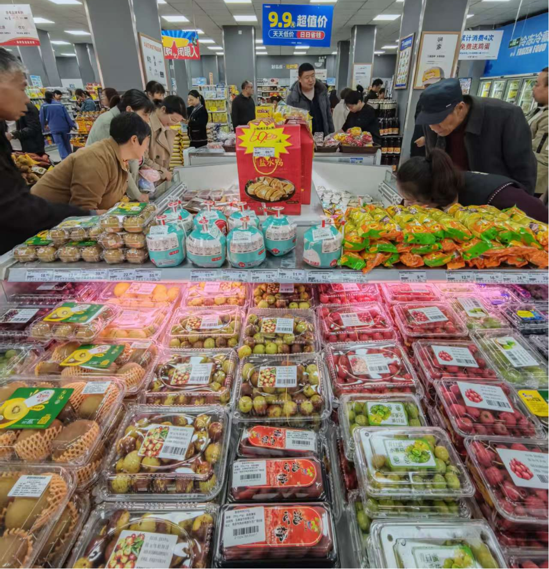 在門(mén)店入口處的生鮮區(qū),熱烈的氣氛尤為明顯。工作人員現(xiàn)場(chǎng)切割腿肉和肋排,手起刀落間盡顯新鮮品質(zhì),吸引了里三層外三層的居民駐足圍觀、詢(xún)價(jià)購(gòu)買(mǎi)?!斑@腿肉看著就新鮮,才7.9元一斤,今天得多買(mǎi)點(diǎn)!”一位正在排隊(duì)的顧客高興地說(shuō)。果蔬區(qū)同樣色彩絢麗、人頭攢動(dòng),飽滿(mǎn)鮮亮的小番茄、藍(lán)莓、大棗、獼猴桃等琳瑯滿(mǎn)目,顧客們推著購(gòu)物車(chē)精心挑選,勾勒出一幅充滿(mǎn)煙火氣的民生畫(huà)卷。