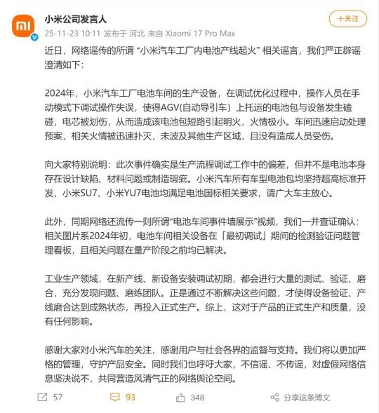 11月23日,小米公司發(fā)言人微博發(fā)文,對近日網(wǎng)傳“小米汽車工廠內(nèi)電池產(chǎn)線起火” 進行回應,原文如下:
