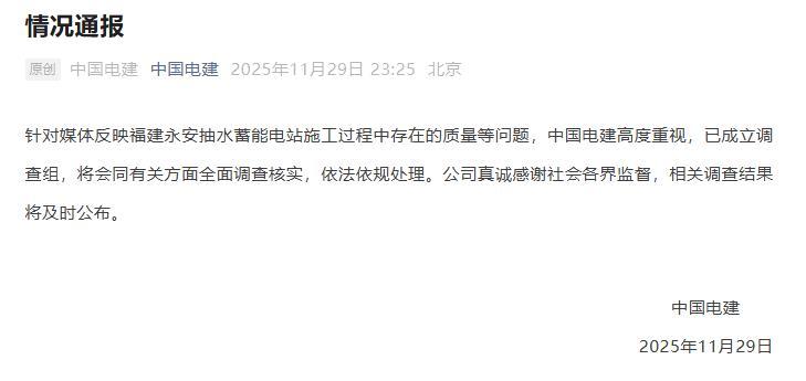 央視網(wǎng)消息:據(jù)中國(guó)電建微信公眾號(hào)消息,中國(guó)電建11月29日晚發(fā)布情況通報(bào),針對(duì)媒體反映福建永安抽水蓄能電站施工過(guò)程中存在的質(zhì)量等問(wèn)題,中國(guó)電建高度重視,已成立調(diào)查組,將會(huì)同有關(guān)方面全面調(diào)查核實(shí),依法依規(guī)處理。公司真誠(chéng)感謝社會(huì)各界監(jiān)督,相關(guān)調(diào)查結(jié)果將及時(shí)公布。