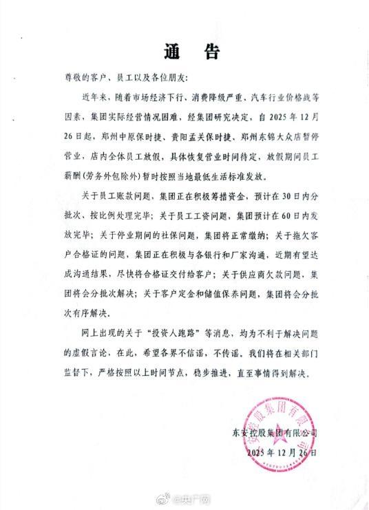 東安集團稱,近年來,汽車行業(yè)價格戰(zhàn)等因素,集團實際經(jīng)營情況困難,經(jīng)集團研究決定,自2025年12月26日起,鄭州中原保時捷、貴陽孟關(guān)保時捷、鄭州東錦大眾店暫停營業(yè)。