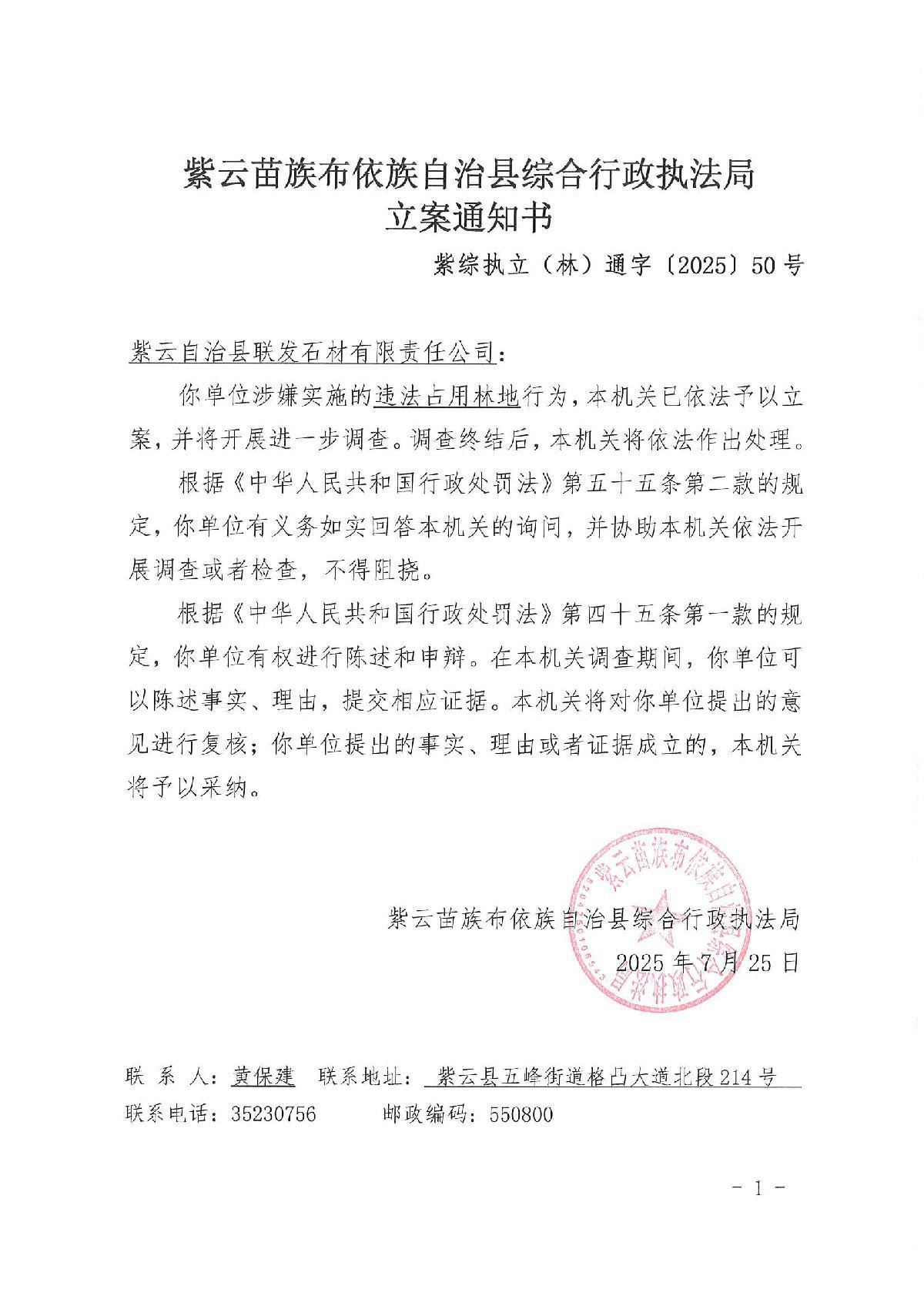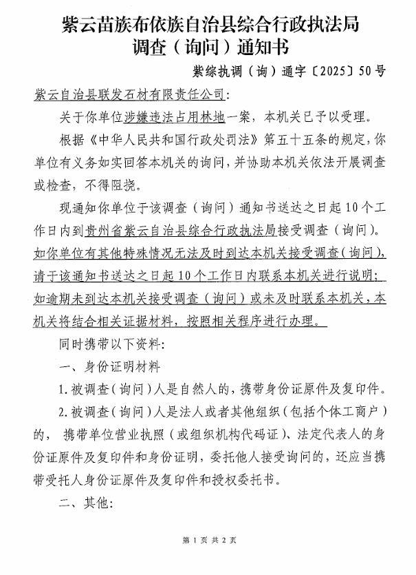 因你公司涉嫌在貴州省紫云自治縣貓營(yíng)鎮(zhèn)普卡橋村違法占用林地一案,我機(jī)關(guān)依法向你公司公告送達(dá)《立案通知書(shū)》【紫綜執(zhí)立(林)通字〔2025〕50號(hào)】及《調(diào)查(詢(xún)問(wèn))通知書(shū)》【紫綜執(zhí)調(diào)(詢(xún))通字〔2025〕50號(hào)】。請(qǐng)于本公告送達(dá)之日起10個(gè)工作日內(nèi)到本機(jī)關(guān)接受調(diào)查、詢(xún)問(wèn)(地址:貴州省紫云自治縣五峰街道格凸大道北段214號(hào);電話(huà):0851-35230756),進(jìn)行陳述、申辯。逾期未聯(lián)系本機(jī)關(guān),本機(jī)關(guān)將依法處理。如對(duì)公告送達(dá)方式有異議,請(qǐng)于本公告發(fā)布之日起7個(gè)工作日內(nèi)提出異議,若逾期未提出異議,上述文書(shū)自本公告發(fā)出之日起三十日,即視為送達(dá)。(見(jiàn)本公告后請(qǐng)聯(lián)系本機(jī)關(guān)簽收上述文書(shū))