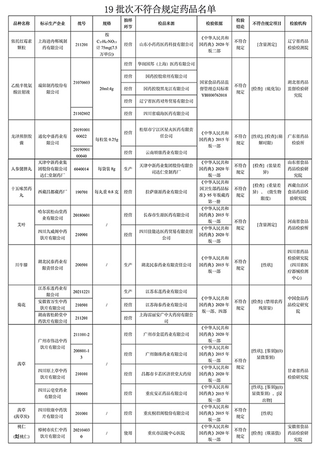 國家藥監(jiān)局表示,對上述不符合規(guī)定藥品,藥品監(jiān)督管理部門已要求相關企業(yè)和單位采取暫停銷售使用、召回等風險控制措施,對不符合規(guī)定原因開展調(diào)查并切實進行整改。