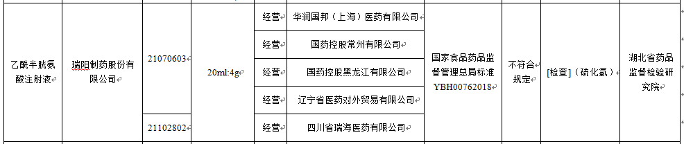 通告顯示,經湖北省藥品監(jiān)督檢驗研究院檢驗,標示為瑞陽制藥股份有限公司生產的2批次乙酰半胱氨酸注射液(批號:21070603、21102802)不符合規(guī)定,不符合規(guī)定項目為硫化氫。