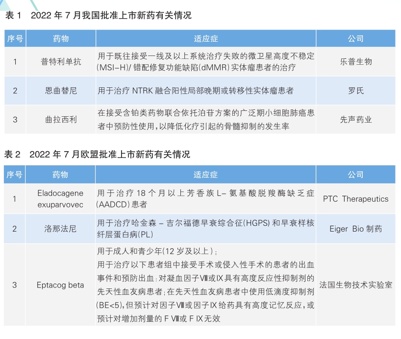 7月份,我國(guó)共批準(zhǔn)3款新藥上市(詳見(jiàn)表1),其中附條件批準(zhǔn)的普特利單抗為我國(guó)藥企樂(lè)普生物自主研發(fā)。
