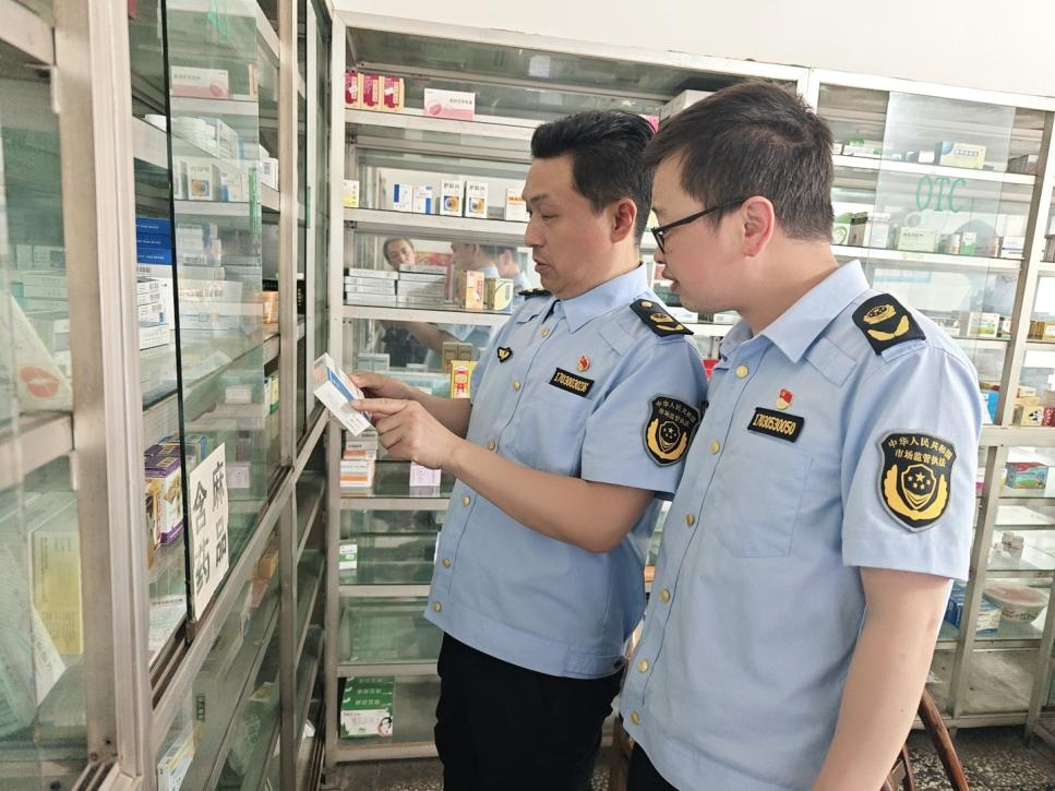 南漳縣市場監(jiān)管局執(zhí)法人員對(duì)“華康藥房”進(jìn)行執(zhí)法檢查。 吳采平/攝