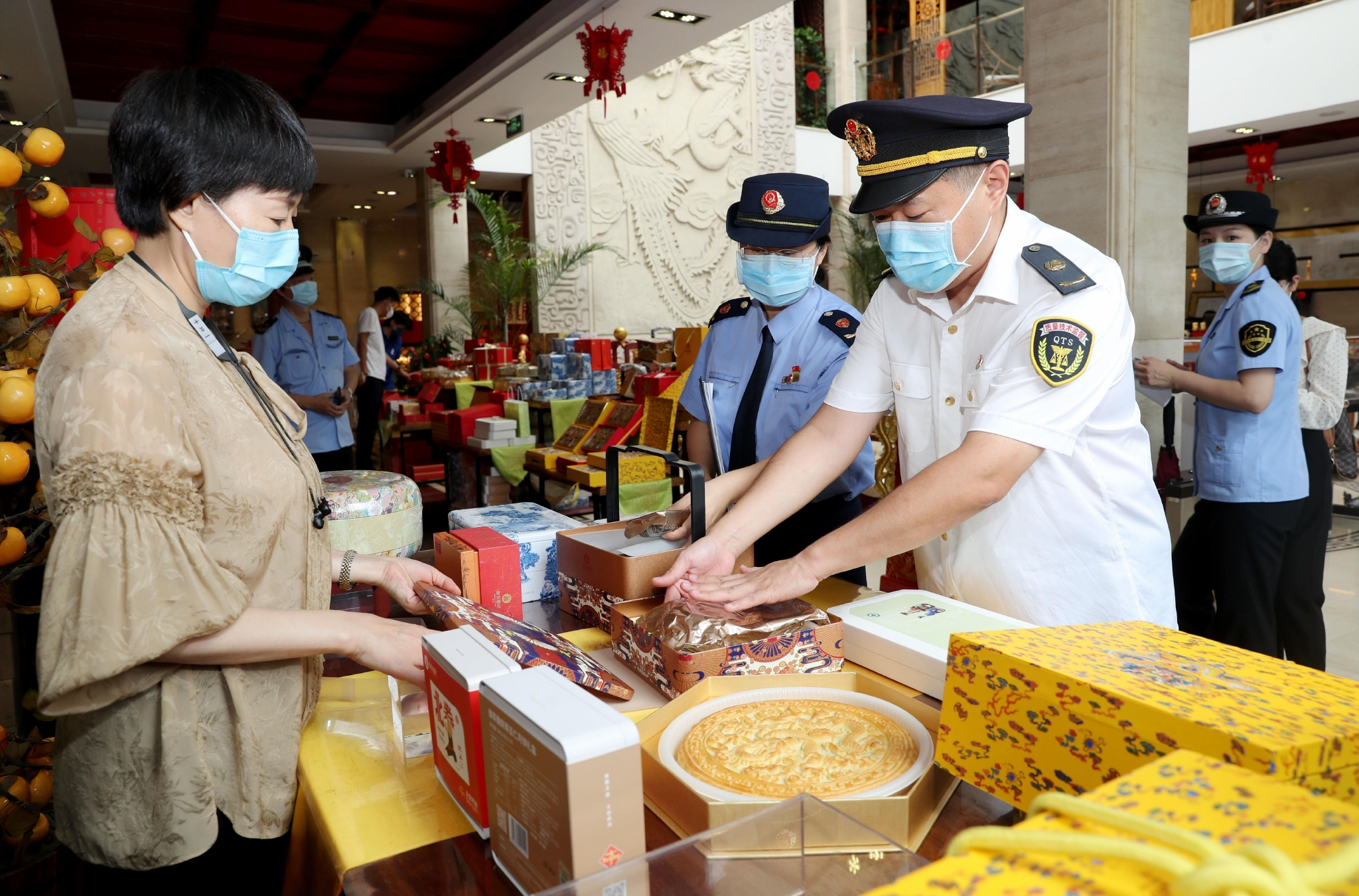 執(zhí)法人員對出廠前的月餅進行包裝檢查。