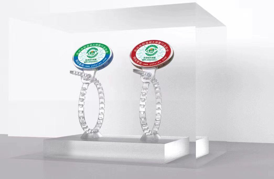 協(xié)會(huì)根據(jù)養(yǎng)殖戶(hù)的養(yǎng)殖面積,按照大閘蟹成熟度分批次發(fā)放防偽蟹扣。2022年版陽(yáng)澄湖大閘蟹農(nóng)產(chǎn)品地理標(biāo)志防偽專(zhuān)用標(biāo)識(shí)分為兩種,一種是深紅色,代表陽(yáng)澄湖湖區(qū)的大閘蟹;另一種是綠色加藍(lán)色,代表高標(biāo)準(zhǔn)養(yǎng)殖池塘的大閘蟹。通過(guò)顏色,消費(fèi)者很容易辨別蟹的產(chǎn)地。
