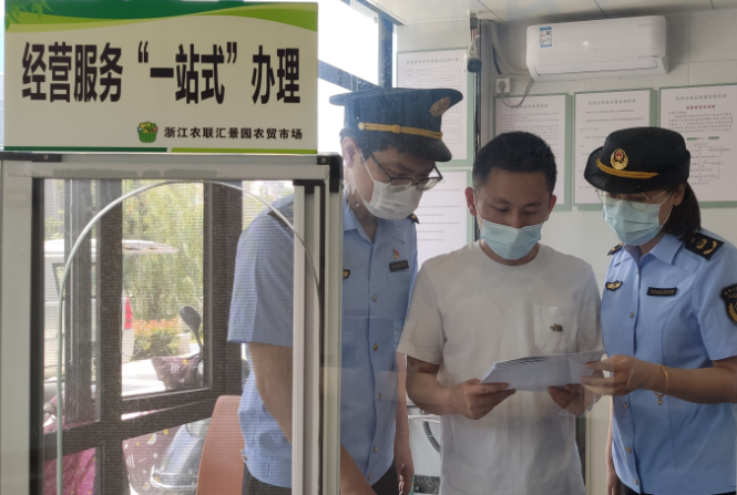 圖為執(zhí)法人員現(xiàn)場(chǎng)檢查匯景園農(nóng)貿(mào)市場(chǎng)農(nóng)殘快速檢測(cè)站相關(guān)臺(tái)賬和設(shè)施設(shè)備運(yùn)行情況。譚靜恒 攝