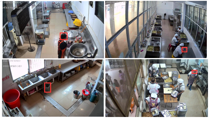 百色市食品安全智能服務平臺系統(tǒng)要求,學校食堂分別在后廚的切配區(qū)、烹飪區(qū)、洗消區(qū)安裝云攝像頭,通過互聯(lián)網(wǎng)接入平臺,重點對學校食堂后廚加工的常見違規(guī)行為,如有害生物、未戴帽子、未戴口罩、吸煙、玩手機、未蓋垃圾桶蓋等,運用AI智能可視化自動抓拍,并將整改通知及時發(fā)送至轄區(qū)監(jiān)管人員和學校食品安全責任人手機上,督促其及時整改,確保了食材加工全視角的過程可控。