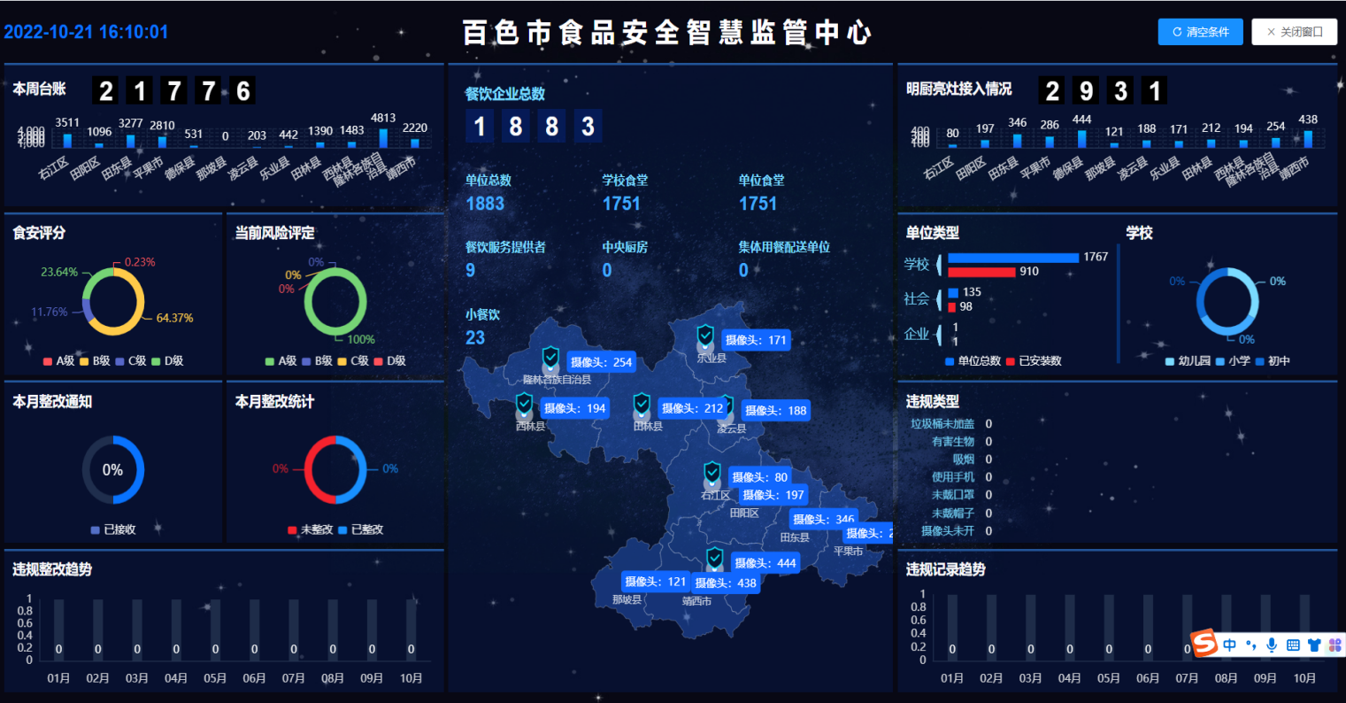 2022年6月,百色市人民政府印發(fā)《百色市學校食堂“互聯(lián)網(wǎng)+明廚亮灶”建設工作方案》,百色市建設了食品安全智能服務平臺,并于2022年7月正式啟用?,F(xiàn)已完成全市學校食堂以及集體配餐單位“互聯(lián)網(wǎng)+明廚亮灶”100%全覆蓋建設。