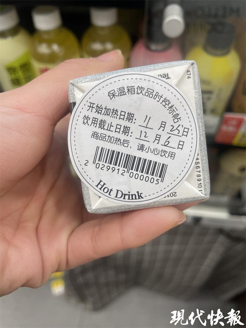 放在暖柜中的飲料,安全飲用期限最受關注。在走訪中,現代快報記者注意到,大部分放置在便利店暖柜中的飲料,都會加貼一張產品標簽。這份產品標簽叫作保溫箱飲品時控標貼,包含了飲品的開始加熱日期和飲用截止日期。按照飲品類別的不同,飲品時控的天數也不一樣。但是幾乎所有飲品在經過加熱保溫處理后的保質期,都比常溫狀態(tài)下的保質期縮短了不少。以一款常溫狀態(tài)下保質期為 9 個月的飲品為例,它在暖柜中經過加熱后,僅有 14 天的賞味期。
