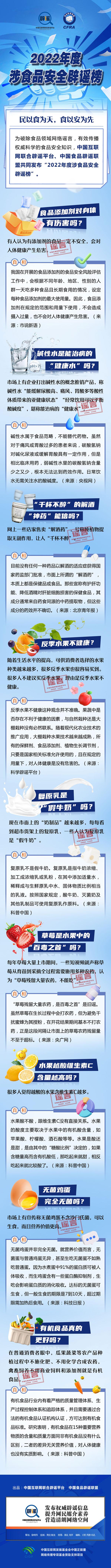民以食為天,食以安為先。食品安全關(guān)系到人民群眾的身體健康和生命安全,受到全社會(huì)高度關(guān)注。為破除食品領(lǐng)域網(wǎng)絡(luò)謠言,有效傳播權(quán)威科學(xué)的食品安全知識(shí),中國(guó)互聯(lián)網(wǎng)聯(lián)合辟謠平臺(tái)、中國(guó)食品辟謠聯(lián)盟共同發(fā)布“2022年度涉食品安全辟謠榜”,讓我們一起對(duì)食品安全謠言說(shuō)不!