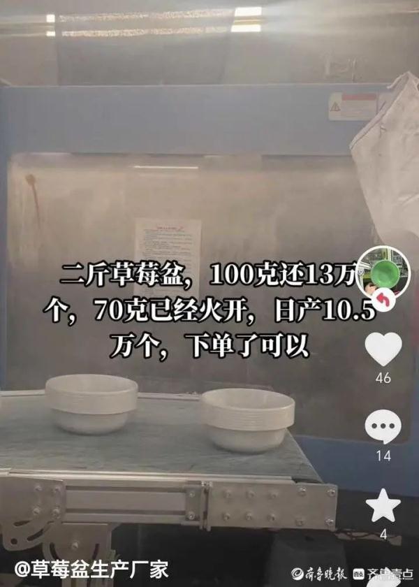 “沒辦法現(xiàn)在商家都是按盆賣,之前我還用這些盆子盛盛切好的菜或者拌拌涼菜,但后來聞著味道挺大,就不敢用了?!饼R女士說,現(xiàn)在她擔心草莓盆的安全問題,買回家的草莓拿出來后多泡泡才會吃。