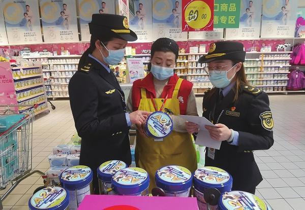 今年2月,嬰幼兒奶粉“新國標”——3項強制性國家標準正式實施。連日來,浙江省湖州市長興縣市場監(jiān)管局對轄區(qū)內大型商超、母嬰用品店進行全面檢查,督促各單位落實明碼標價,把好食品安全主體責任關。圖為該局執(zhí)法人員正在對轄區(qū)內一家商超進行檢查。