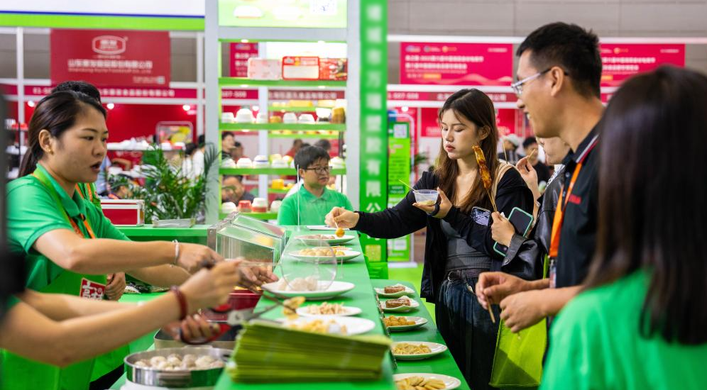 9月15日,在長沙國際會展中心,觀眾在品嘗小吃。
