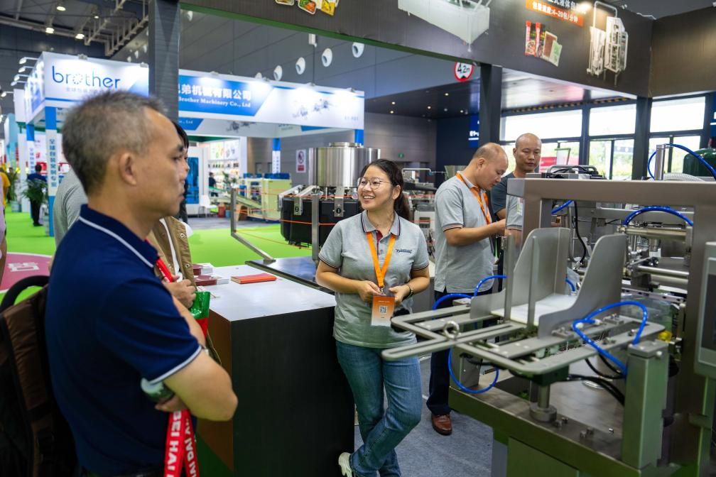 9月15日,在長沙國際會展中心,參展商(中)向觀眾介紹食品包裝設(shè)備。