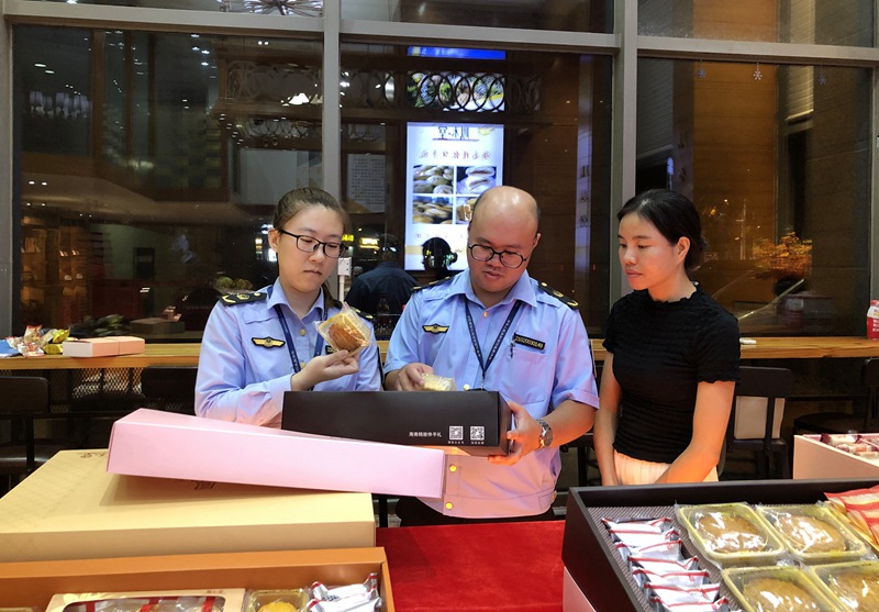市場(chǎng)監(jiān)督管理局工作人員正在銷(xiāo)售店內(nèi)檢查月餅包裝情況。海南省市場(chǎng)監(jiān)督管理局供圖