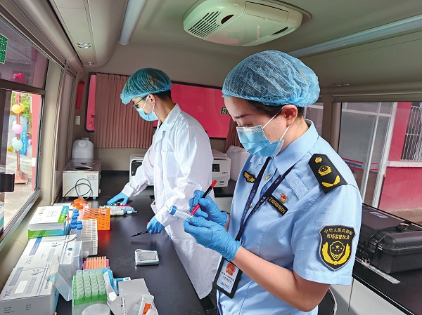 中、高考期間,重慶市南岸區(qū)市場監(jiān)管局組織工作人員深入考點(diǎn),現(xiàn)場開展食品安全快速檢測。(荊杰 謝旺)