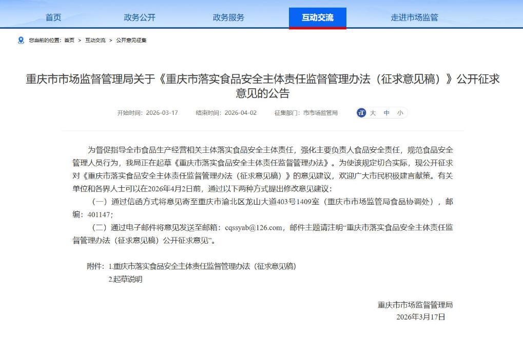 為進(jìn)一步梳理、細(xì)化、規(guī)范各類食品生產(chǎn)經(jīng)營主體的食品安全主體責(zé)任制要求,持續(xù)推動食品安全風(fēng)險(xiǎn)防線前移,不斷提升食品安全管控質(zhì)效,近日,重慶市市場監(jiān)督管理局起草了《重慶市落實(shí)食品安全主體責(zé)任監(jiān)督管理辦法(征求意見稿)》(以下簡稱《辦法》),現(xiàn)向社會公開征求意見建議。