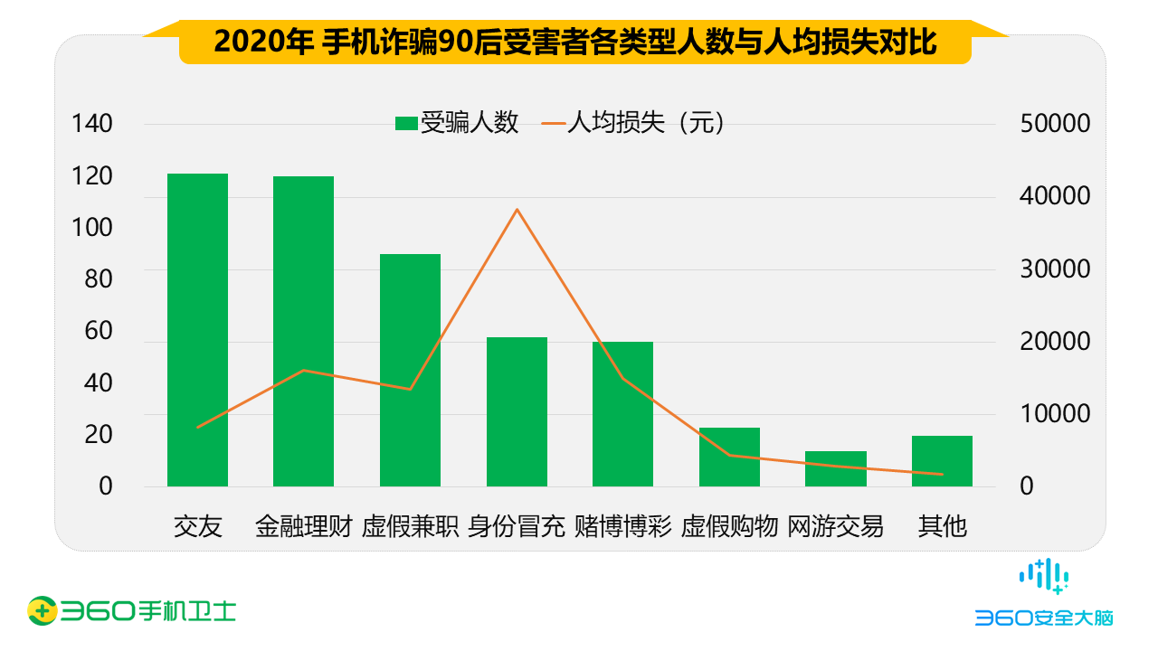 《2020年中國手機安全狀況報告》顯示,在網絡詐騙舉報用戶中,90后的手機詐騙受害者占所有受害者總數(shù)的37.5%,是不法分子從事網絡詐騙的主要受眾人群;其次是00后,占比為28.7%;80后占比為24.1%。而在人們印象中更容易遭受手機詐騙的70后和60后人群,僅占比不到10%。