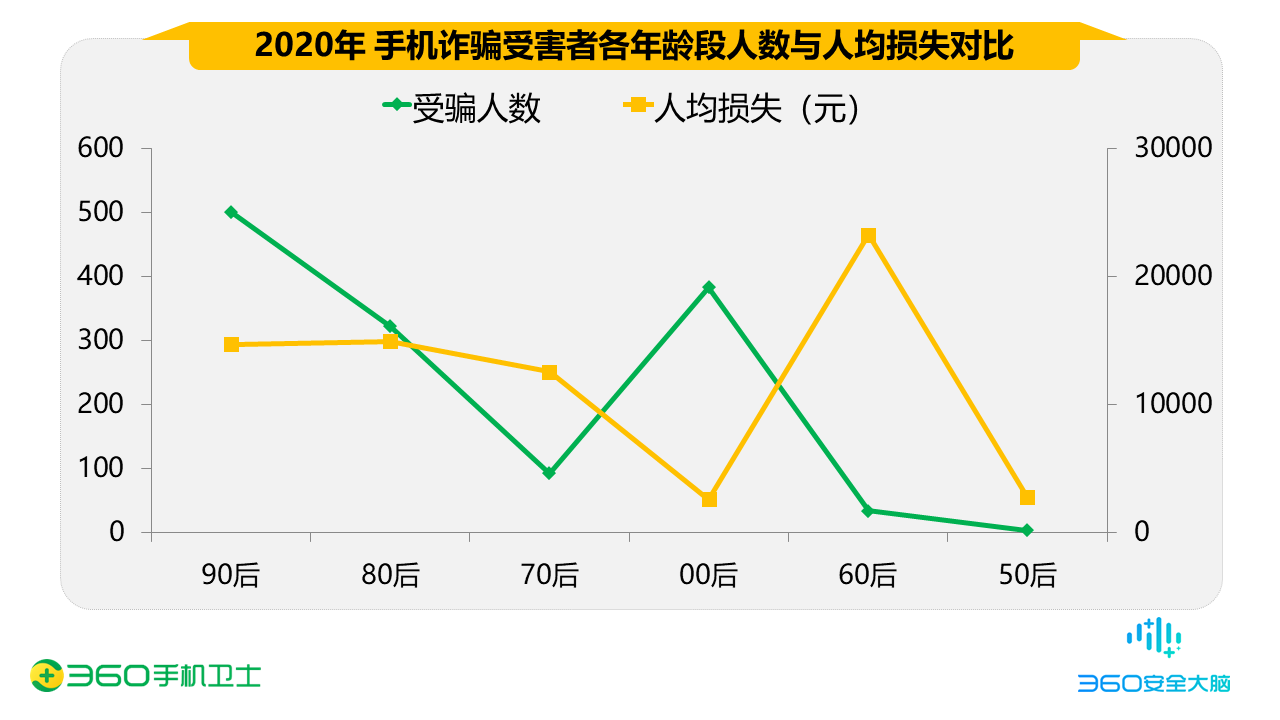 然而,90后雖然受騙人數(shù)較多,但人均損失較低。60后一旦落入網絡騙局,則會損失慘重,人均損失超過兩萬元。