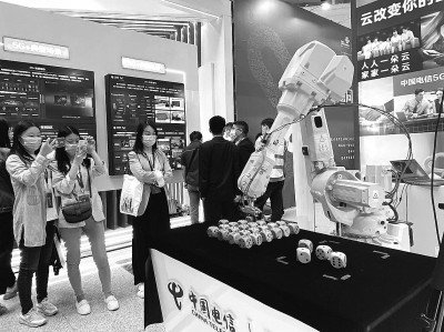 5月17日,2021年世界電信和信息社會日大會上,人們正在圍觀一款5G工業(yè)機器人。本報記者 劉坤攝/光明圖片