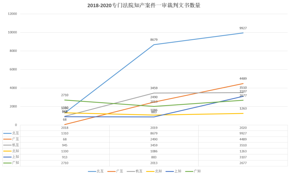 從整體趨勢(shì)上看,6個(gè)專門法院中除廣知外均呈現(xiàn)上升趨勢(shì);三大互聯(lián)法院裁判文書的總數(shù)量整體高于三大知識(shí)產(chǎn)權(quán)法院。其中,北互、廣互從2018-2020年數(shù)據(jù)呈現(xiàn)一個(gè)快速攀升的趨勢(shì),北互的裁判文書數(shù)量從1310上升到9927,廣互的裁判文書數(shù)量從68上升到4489。