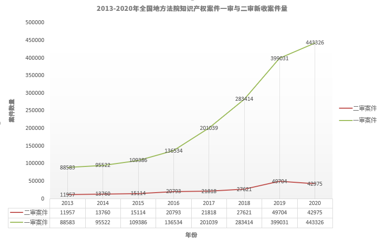 根據(jù)最高人民法院各年度知識(shí)產(chǎn)權(quán)司法保護(hù)白皮書(2013-2020年)的公開數(shù)據(jù),本報(bào)告總結(jié)了這八年的總體收案情況(表一)。總體而言,全國地方法院知識(shí)產(chǎn)權(quán)案件一審與二審新收案件量均呈現(xiàn)逐年遞增趨勢(shì),其中一審新收案件量從2013年的88583件,增長至2020年的443326件,增長約4倍;二審新收案件量從2013年的11957件,增長至2020年的42975件,增長約2.6倍。此外,一審案件數(shù)量增幅明顯大于二審案件數(shù)量,一定程度上反映了我國一審案件審判質(zhì)效逐步提高,多數(shù)知識(shí)產(chǎn)權(quán)案件在一審階段得到解決。