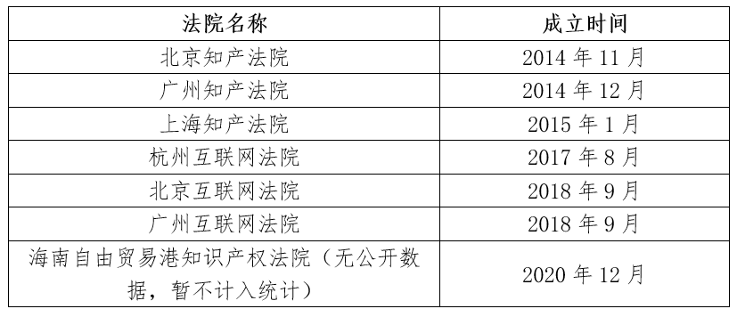 在設(shè)立時(shí)間上,知識(shí)產(chǎn)權(quán)專門法院要早于互聯(lián)網(wǎng)專門法院,6家專門法院的設(shè)立時(shí)間如表五。