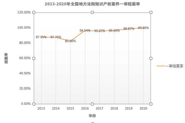 知識(shí)產(chǎn)權(quán)案件一審結(jié)案率整體上呈現(xiàn)逐年遞增趨勢(shì),其中2016年后結(jié)案率均保持在95%以上,2020年則達(dá)到峰值(99.86%),直觀反映了我國知識(shí)產(chǎn)權(quán)案件的審理效率不斷提高,并在一定程度上反映了人民法院知識(shí)產(chǎn)權(quán)民事審判改革的成效。例如,2016年結(jié)案率的爬升跟2015年員額制改革的整體成效不無關(guān)系。