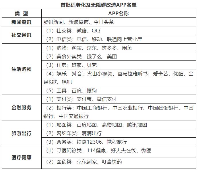 《方案》要求,開展老年人、殘疾人常用移動互聯(lián)網(wǎng)應(yīng)用(APP)的適老化及無障礙改造。立足老年人、殘疾人的實(shí)際生活體驗(yàn),豐富滿足其需求的移動互聯(lián)網(wǎng)應(yīng)用種類和功能,對《工業(yè)和信息化部中國殘疾人聯(lián)合會關(guān)于推進(jìn)信息無障礙的指導(dǎo)意見》中列出的移動互聯(lián)網(wǎng)應(yīng)用十大領(lǐng)域、注冊用戶數(shù)超過5000萬人、同類產(chǎn)品中市場份額排名前5名的APP進(jìn)行適老化及無障礙改造。首批優(yōu)先推動新聞資訊、社交通訊、生活購物、金融服務(wù)、旅游出行、醫(yī)療健康等6大類、共43個(gè)APP進(jìn)行適老化及無障礙改造。中國信息通信研究院協(xié)助各互聯(lián)網(wǎng)企業(yè),在開發(fā)設(shè)計(jì)移動互聯(lián)網(wǎng)應(yīng)用(APP)的過程中落實(shí)信息無障礙有關(guān)標(biāo)準(zhǔn)的要求,并將無障礙優(yōu)化納入產(chǎn)品及服務(wù)的日常維護(hù)流程。